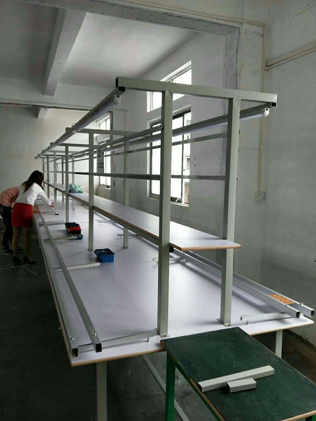 6.線體配置: (1)日光燈 (2)儀表臺(tái) (3)工藝圖板 (4)工具箱配有220V電源插座 (5)搖桿 ( 6)元件盒。