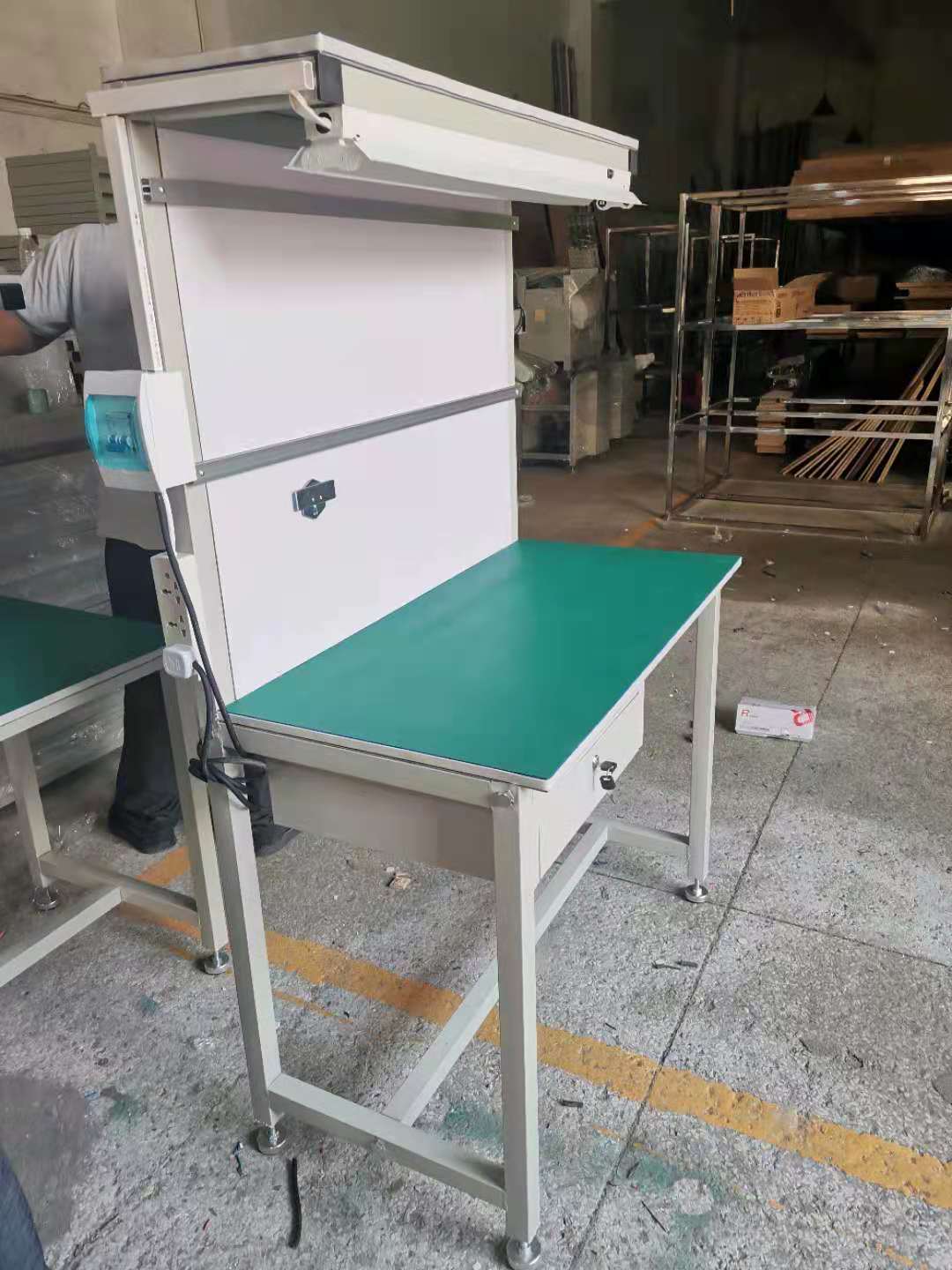 5.可配置:照明燈,工藝卡,插座,物料臺(tái),吸煙罩,氣管,風(fēng)批吊軌,電風(fēng)扇等。