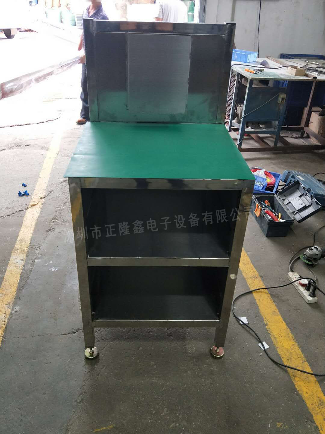 1、防靜電工作臺(tái):不銹鋼板上面鋪綠色防靜電膠皮,有導(dǎo)電線;
